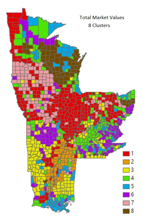 Group 7: These are the hog juggernauts. These counties make less than 64% of their income on cropping, BUT, more than 10% on hogs. This area produces a ton of grains, from an acreage standpoint, however, the hogs are the primary economic drivers. This area encompasses Southern Minnesota, and Northern Iowa