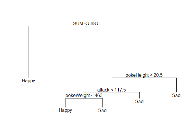 This simplified tree shows that the less powerful pokemon (with SUM of all stats less than 568.9), tend to be happier. If pokemon have high sum of stats, only those have a low weight (less than 463 units), tend to have high happiness. So, overall, the regression tree supports the graphs looking at weight and power as a negative indicator.